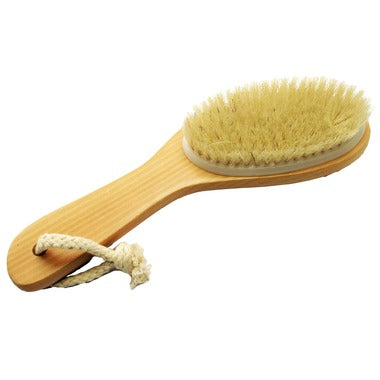 A natural bristled body brush, with a comfy short wooden handle to fit perfectly in your hand. Can be used in the shower, bath, or for dry brushing.