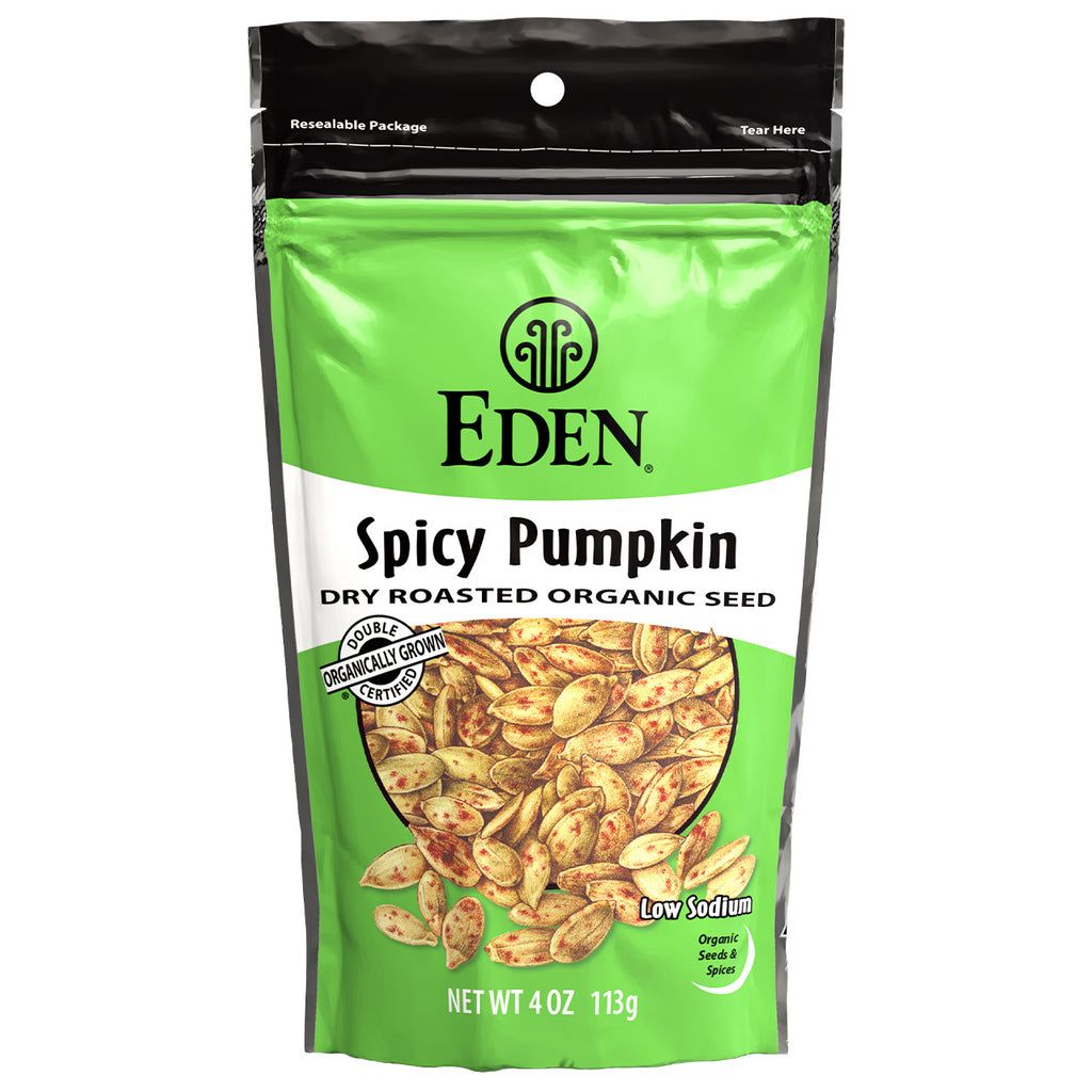 Dry roasted organic pumpkin seeds lightly coated with a bit of organic Eden tamari soy sauce mixed with organic garlic powder and organic cayenne pepper. A unique, hot and spicy snack food. Men's Health magazine awarded 'Best Organic Food for Men' stating, 'Seasoned with soy sauce, garlic, and cayenne, these put spicy chips to shame.' Low sodium and rich in protein, magnesium, and zinc. A good source of fiber and iron. Great for parties, camping, backpacking, or a nutritious snack any time. Reclosable standing pouch